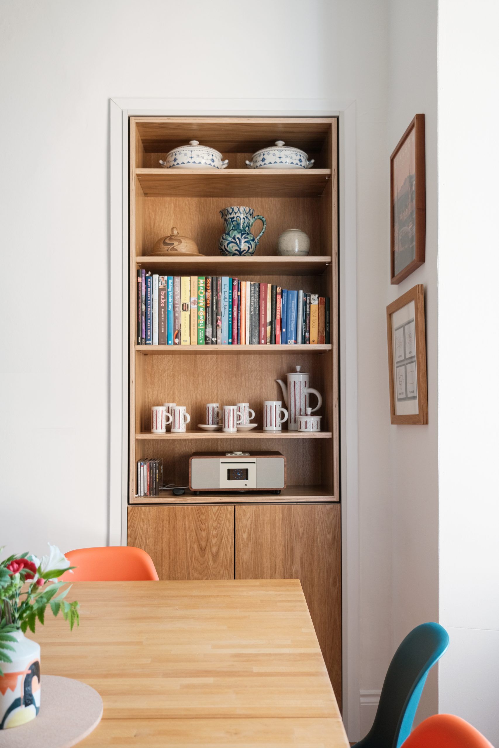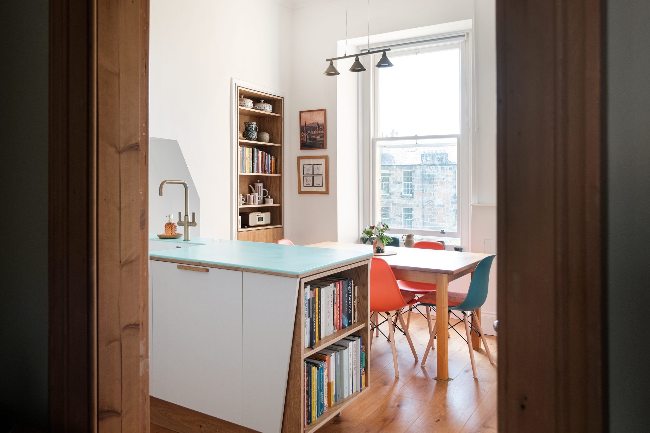 This is Robert and Amanda’s stunning kitchen, made in collaboration with KitCaboose. We crafted a functional and stylish kitchen in a classic Glasgow tenement. The principle of ‘form follows function‘ was key in guiding us to innovative solutions like a swooped worktop and custom L-shaped cabinets to navigate a tricky recess and chimney breast.